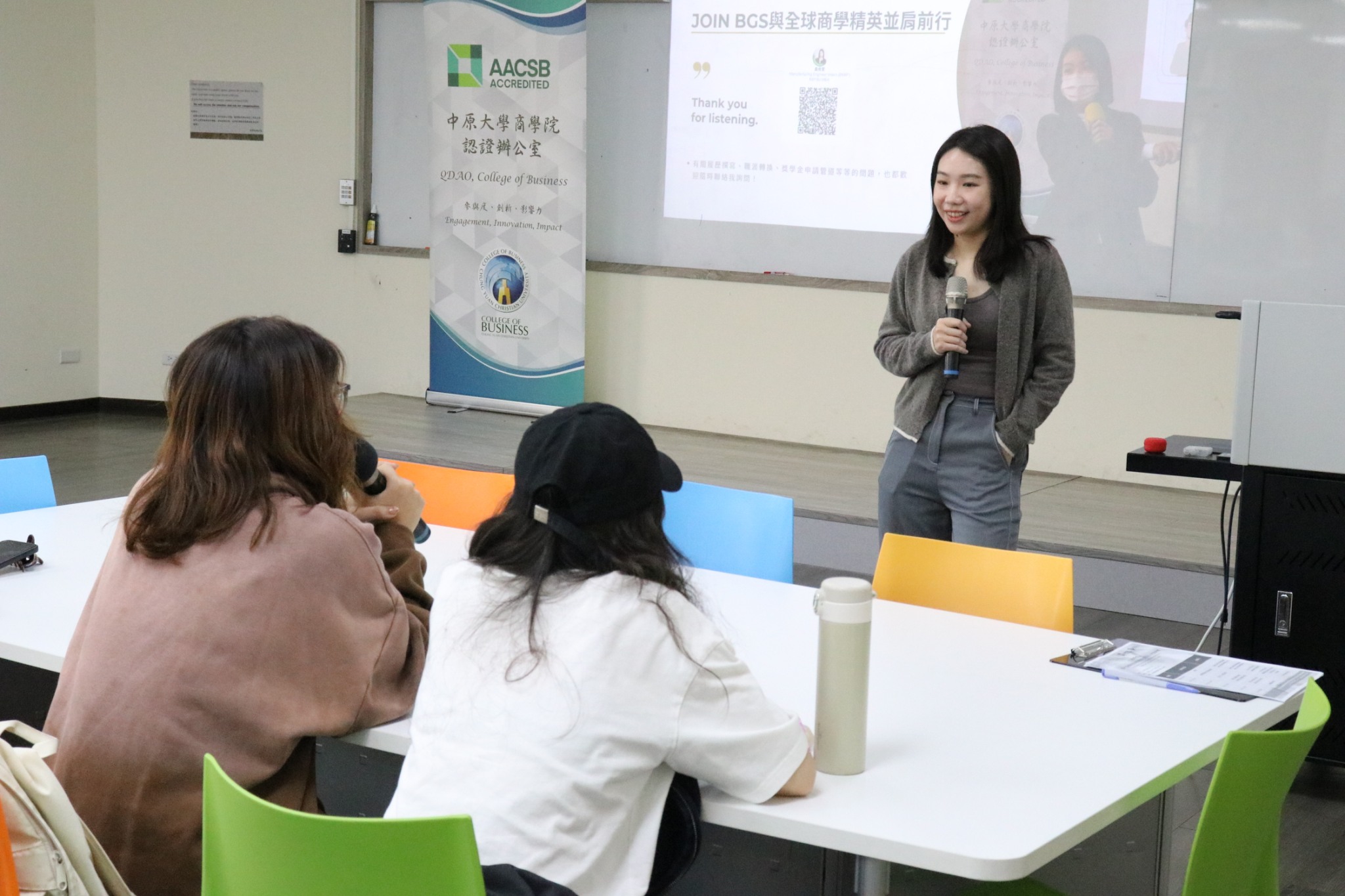 會中邀請到第二屆BGS國際學生會會長、企管系校友昌佳雯回母校分享。她從中原「全人標竿獎」出發,進入國立中山大學攻讀研究所,再成功獲得台積電正式聘任,並入選教育部「青年佰億計畫」赴美交流。她表示:「BGS不只是榮譽,更是開啟國際舞台的第一步。」