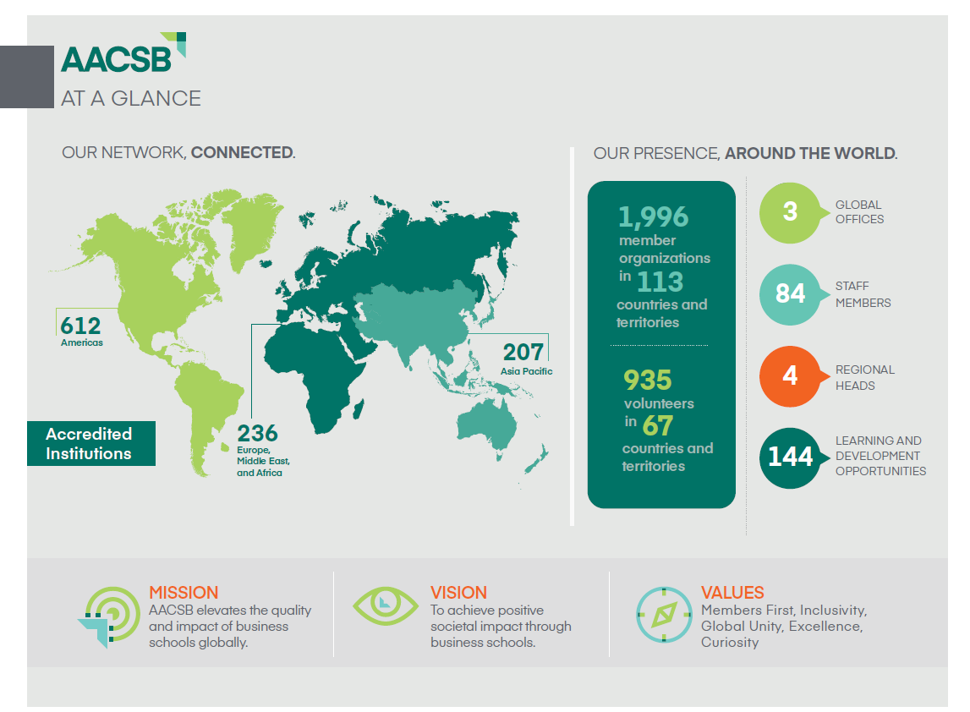 AACSB 的官方使命是推動與提升商管教育,範圍包含教師、職員的訓練,以及從事商管教育相關的研究、調查,亦會與其他教育聯盟做學術與教育之交流保持密切關係,並提供各種與高等商管教育相關之議題與報告,以提升各地高等商管教育學院之水準。